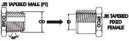 The Japanese tapered pipe thread connector is identical to and interchangeable with the BSPT (tapered) connector. The Japanese male thread does not have a 30° Flare, and will not mate with the BSPP female swivel with conical seat. The seal on the Japanese tapered pipe thread connector is made on the threads. Use of a thread sealant is recommended. Thread form per JIS B 0203 (identical to BSPT).